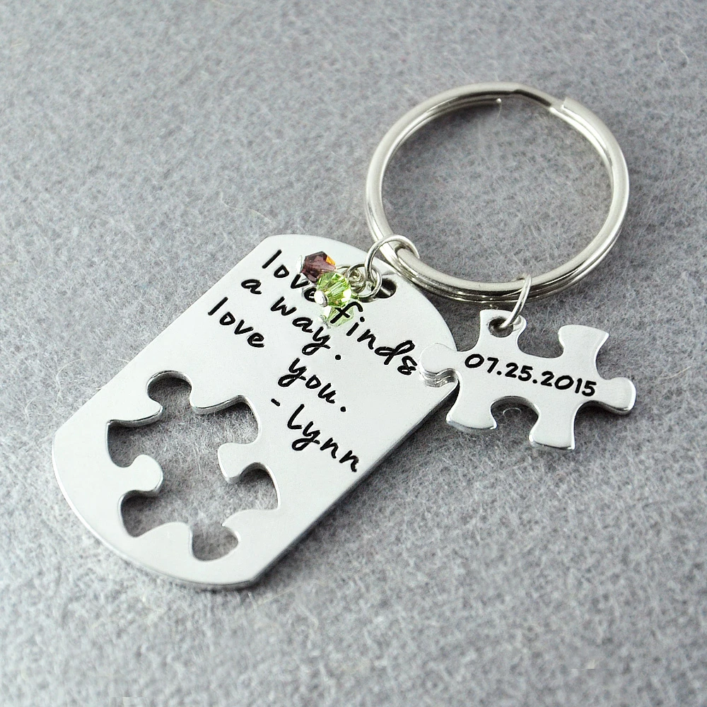 Porte Cles De Puzzle Personnalise Porte Cles En Alliage Personnalise Avec Pierre De Naissance Estampille A La Main Votre Phrase Et Votre Date Porte Cles De Puzzle Aliexpress